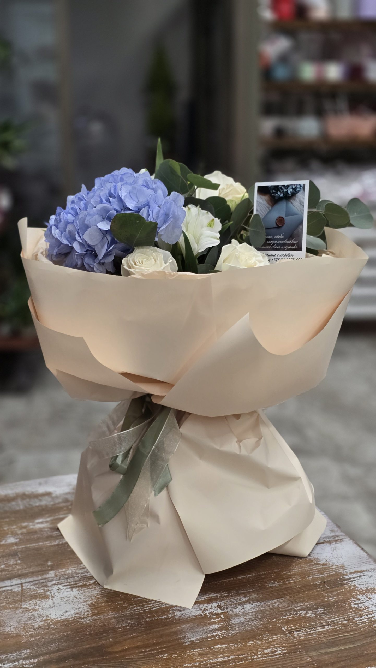 Состав букета: Гортензия белого цвета -1шт, Роза кустовая-2шт, Эвкалипт,упаковка,открытка.