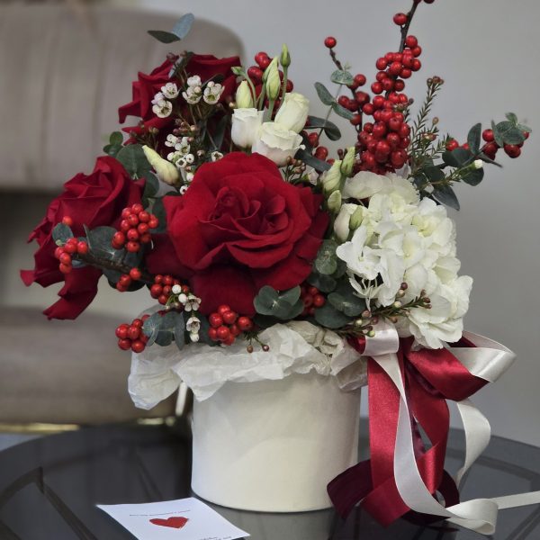 Состав композиции: Роза Фридом-3шт, Гортензия-1шт., Эустома-1шт., Илекс-1шт., Хамелациум-1шт., Зелень-эвкалипт., шляпная коробка-диаметр 14см., открытка,атласная лента.