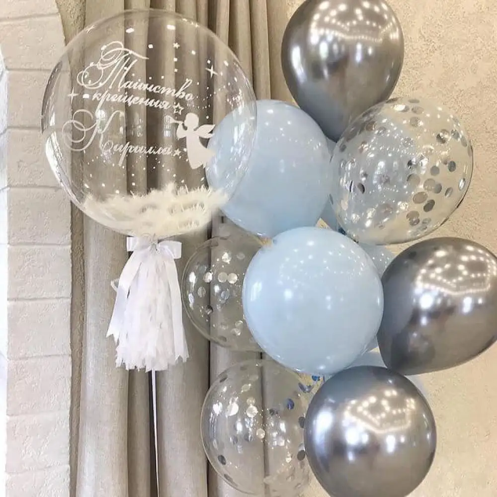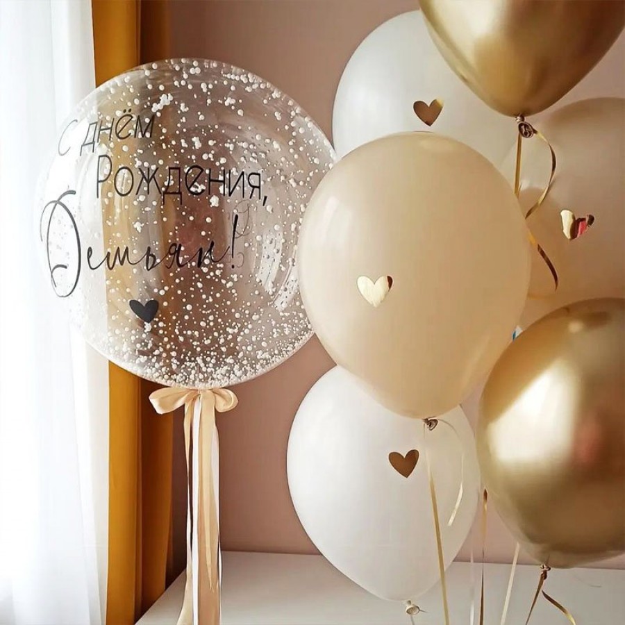 Латексный шарик прозрачного цвета с конфетти, наполненный гелием с лентой. Размер шарика в надутом виде-30см. Шарики обрабатываются специальной обработкой,которая увеличивает время полета шарика. Друзья, чтобы обеспечить более длительное время полета шарика, необходимо соблюдать условия эксплуатации: